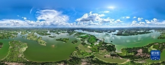 8月6日,湖南桂陽(yáng)舂陵國(guó)家濕地公園,綠水、濕地、藍(lán)天相映成趣,構(gòu)成一幅秀美的夏日生態(tài)畫卷(無(wú)人機(jī)全景照片)。