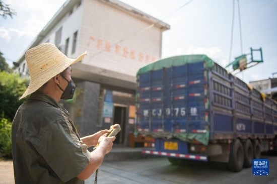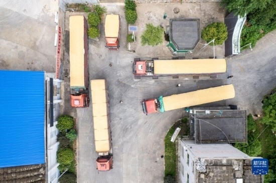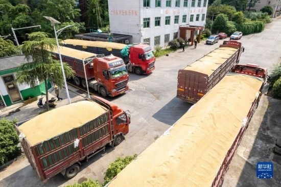8月7日,運糧車在湖南安仁國家糧食儲備庫排隊過磅(無人機照片)。