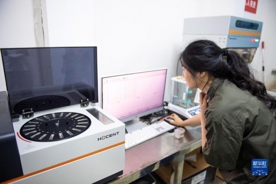 8月7日,在湖南安仁國家糧食儲備庫檢測中心,工作人員操作食品重金屬快速檢測儀抽檢入庫糧食的重金屬含量。