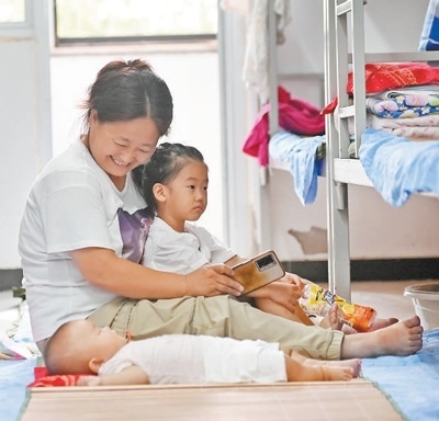 8月12日,在天津市靜海區(qū)大邱莊中學(xué)集中安置點,轉(zhuǎn)移群眾在宿舍內(nèi)照看孩子。新華社記者 趙子碩攝