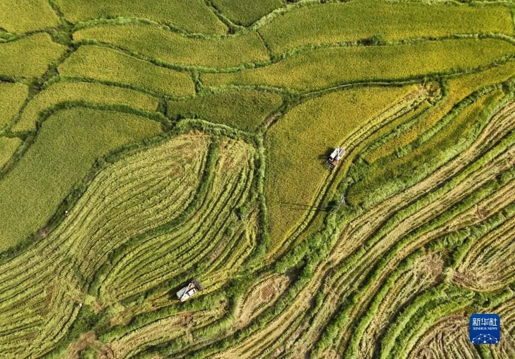 近日,四川東部廣安市近200萬畝水稻進(jìn)入成熟收獲期,農(nóng)民在田間忙碌,收獲水稻。