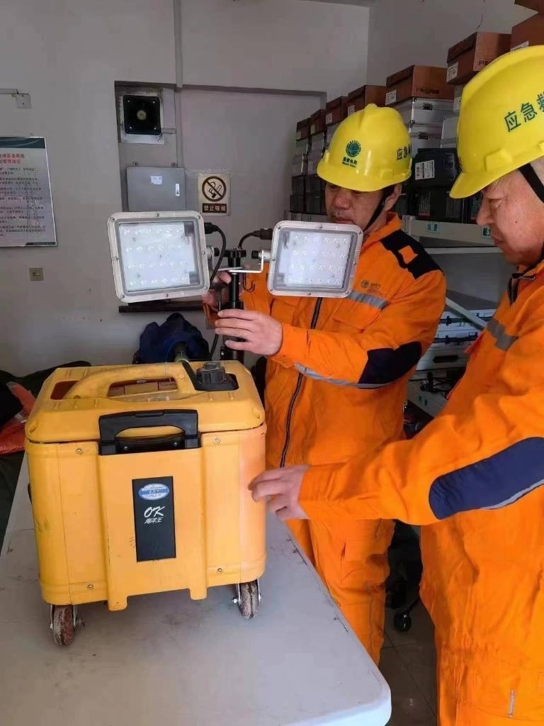 在鳳城市藍旗鎮(zhèn)廣勝村小學臨時安置點,藍旗鎮(zhèn)供電所工作人員正在調(diào)試應(yīng)急照明設(shè)備。(國網(wǎng)丹東供電公司供圖)