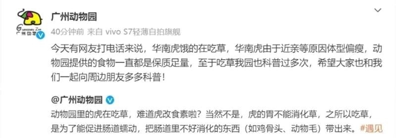 ·廣州動物園老虎餓得吃草?園方:食物一直保質(zhì)保量。