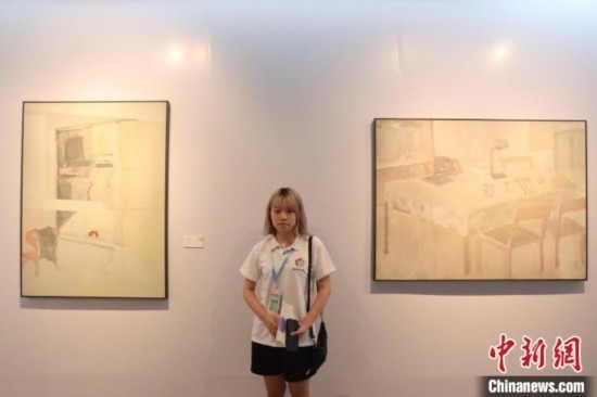 8月26日下午,廣東省廣州市,粵臺(tái)學(xué)子中華情——2023兩岸大學(xué)生文化藝術(shù)夏令營(yíng)啟動(dòng)儀式暨“融·合”兩岸大學(xué)生藝術(shù)交流展開(kāi)幕式在廣東華僑博物館舉行。圖為臺(tái)灣學(xué)生在兩岸大學(xué)生藝術(shù)交流展作品前留影。吳善基攝