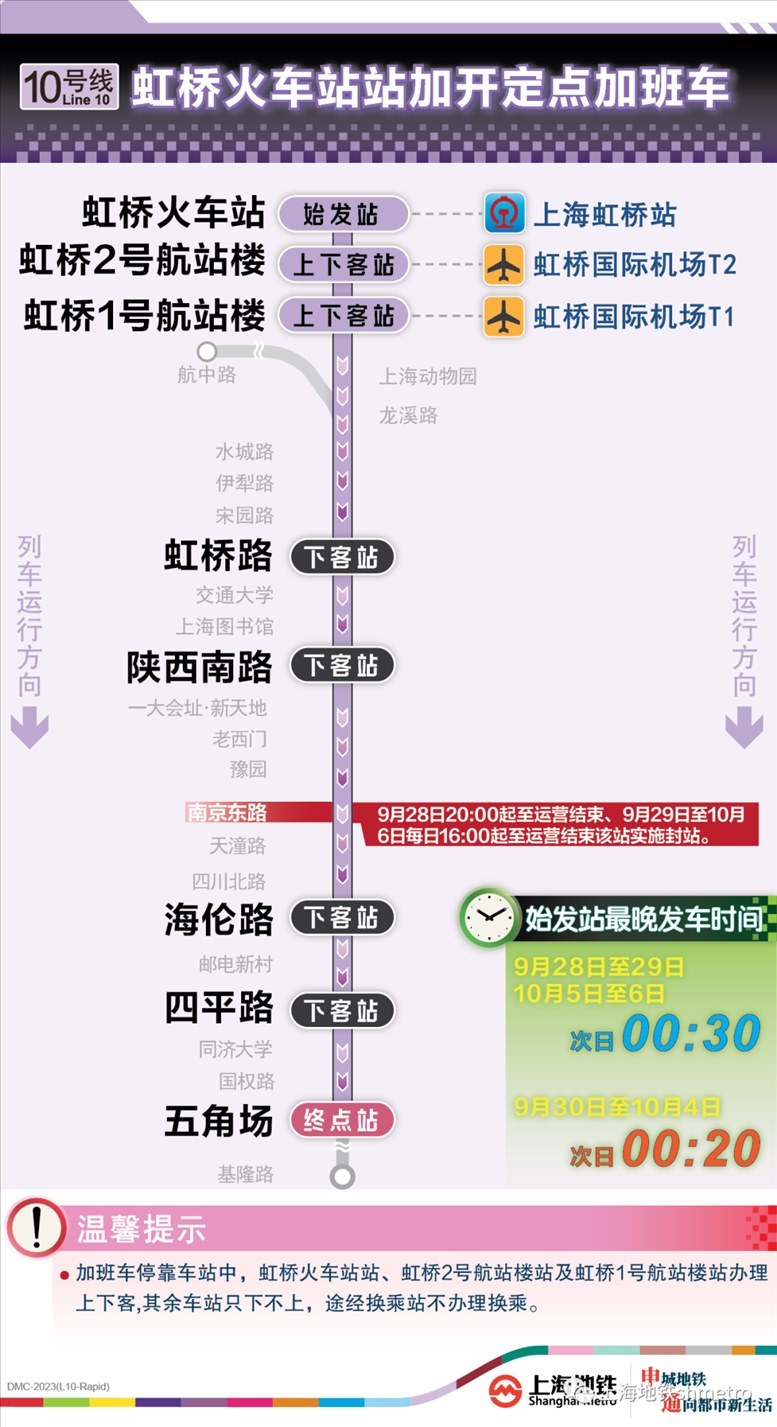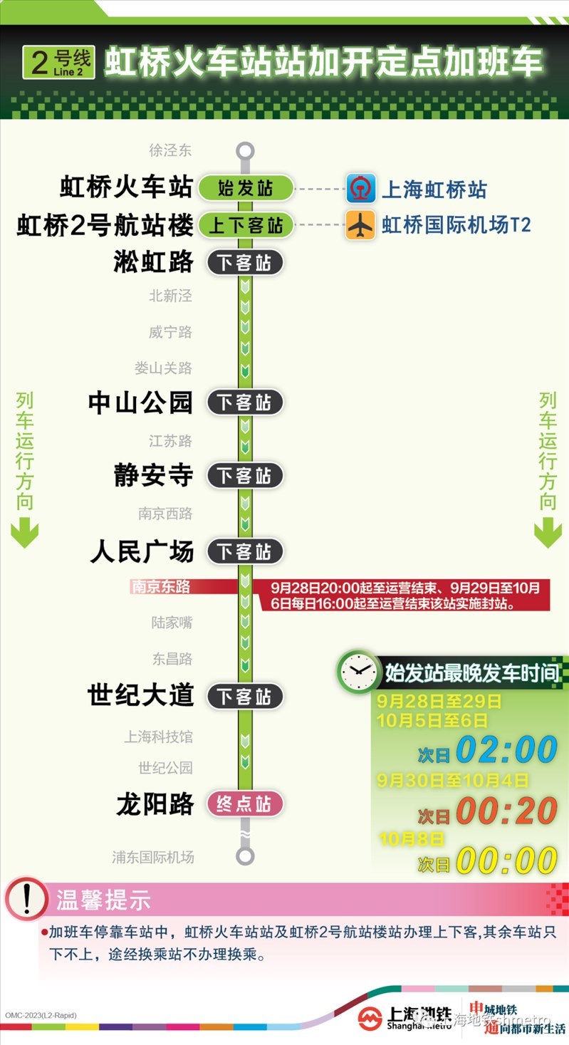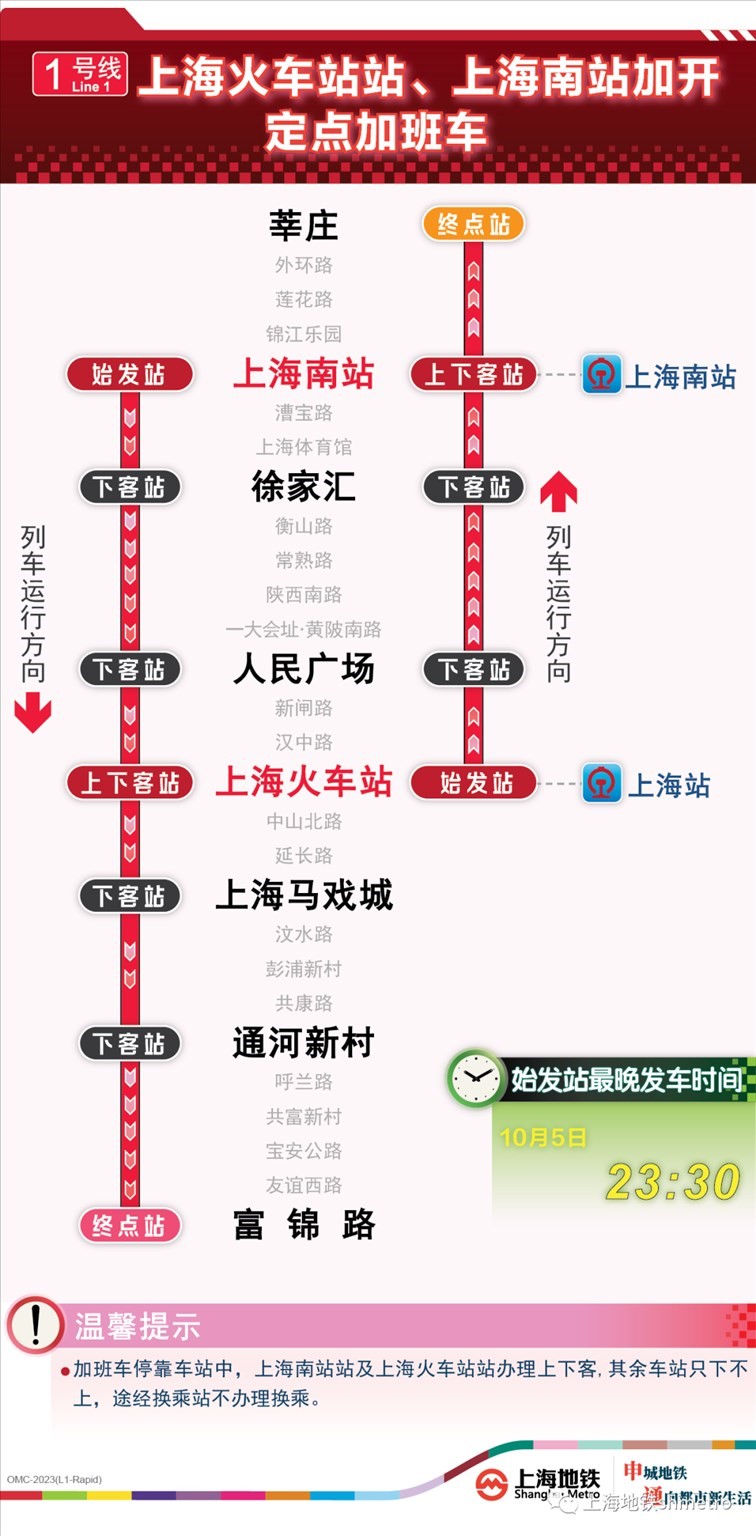 此外為做好節(jié)假日返程期間上?;疖囌尽⒑鐦蚧疖囌?、上海南站的夜間客流疏散工作,10月5日,地鐵1號線在圖定基礎(chǔ)上實施定點加開方案,加開末班車發(fā)車時間至23:30;另10月8日地鐵2號線增加定點加班車班次,加開末班車發(fā)車時間至次日0:00。