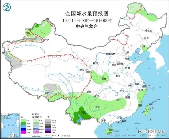 10月14日08時(shí)至15日08時(shí),內(nèi)蒙古東北部、新疆西部、西藏南部等地部分地區(qū)有小到中雪或雨夾雪;黑龍江西北部、遼寧東部、陜西南部、甘肅東南部、四川南部、貴州大部、云南、廣西西部、湖南中南部、江西西南部、浙江中東部、福建東部、海南島及臺(tái)灣島等地部分地區(qū)有小到中雨,其中,云南南部局地有大雨。內(nèi)蒙古東北部、新疆西北部、河北北部等地部分地區(qū)有5~6級(jí)風(fēng);渤海、渤海海峽等海域有6~7級(jí)風(fēng)、陣風(fēng)8~9級(jí)。(見圖3)。