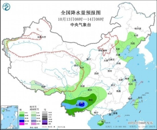 10月12日08時(shí)至13日08時(shí),西藏東部、青海北部和東部、甘肅西部、川西高原西北部等地部分地區(qū)有小到中雪或雨夾雪;西藏東南部、四川南部、貴州西部、云南中西部及海南島中東部等地部分地區(qū)有中到大雨,其中,云南西部局地有暴雨(50~60毫米)。西藏中部、四川盆地北部、河北北部等地部分地區(qū)有4-6級(jí)風(fēng);東海大部海域、臺(tái)灣海峽、臺(tái)灣以東洋面、巴士海峽、南海北部和中部海域、北部灣等海域有5~7級(jí)風(fēng)、陣風(fēng)8級(jí)。(見圖1)。
