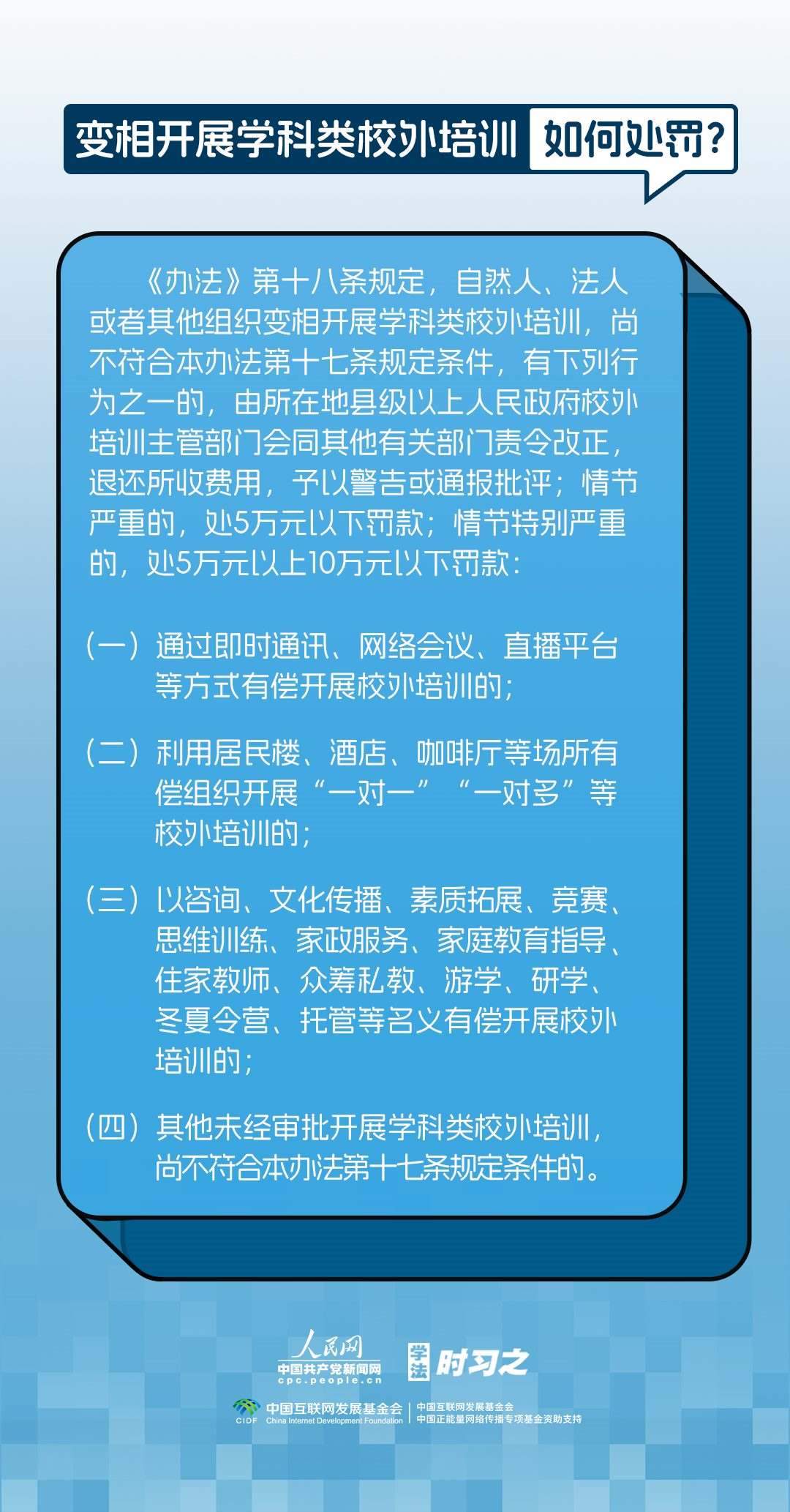 《校外培訓行政處罰暫行辦法》(以下簡稱《辦法》)將于2023年10月15日起施行?!掇k法》提出了校外培訓行政處罰總體要求。規(guī)定適用對象為面向社會招收3周歲以上學齡前兒童、中小學生,違法開展校外培訓的自然人、法人或者其他組織。要求校外培訓行政處罰應當遵循公正、公開的原則,堅持處罰與教育相結合,引導自然人、法人或者其他組織自覺守法,共同抵制校外培訓違法行為,營造有利于學生成長成才的良好環(huán)境。