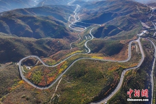 10月15日,航拍山西省太原市天龍山網(wǎng)紅橋秋景絢麗。近日,天龍山迎來秋景最佳觀賞期。中新社記者 武俊杰 攝