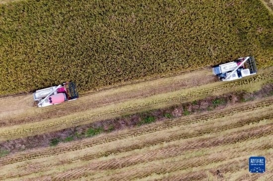 在湖北省天門(mén)市石家河鎮(zhèn)唐店村,農(nóng)民操作農(nóng)機(jī)收割水稻(無(wú)人機(jī)照片,10月19日攝)。