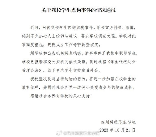 ·四川一高職院校學生宰殺流浪狗?校方:涉事兩名學生被留校察看,警方介入。