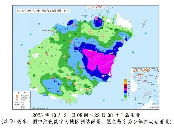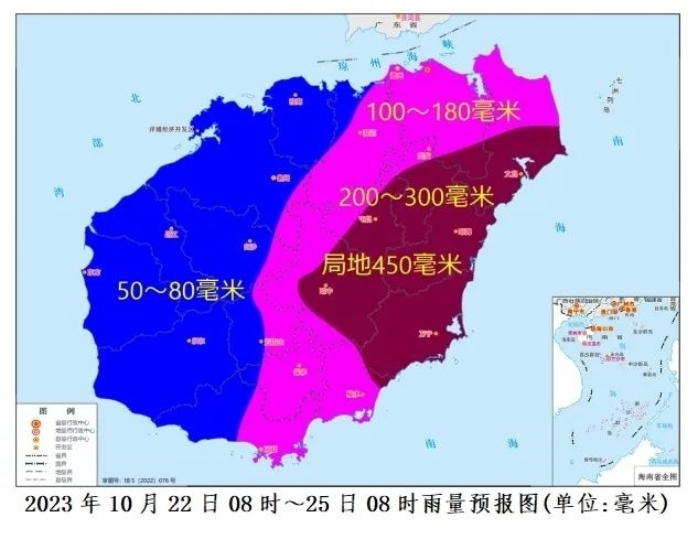 預計,10月22日08時~25日08時各地累積雨量:文昌、瓊海、瓊中、屯昌和萬寧200~300毫米、局地450毫米,???、澄邁、定安、保亭、陵水和三亞100~180毫米,其余市縣50~80毫米。