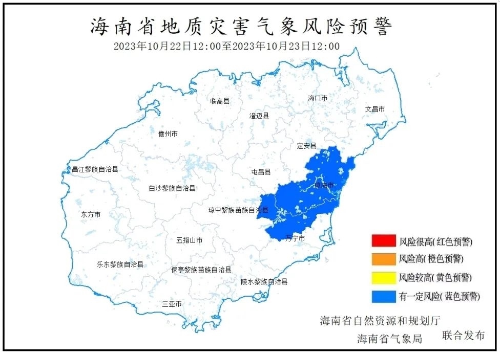 海南省自然資源和規(guī)劃廳、海南省氣象局2023年10月22日10時聯(lián)合發(fā)布地質(zhì)災害氣象風險預警:根據(jù)海南省氣象臺前期降雨實況和未來24小時降雨預報,預計未來24小時(2023年10月22日12:00-10月23日12:00)瓊海市全境,萬寧市龍滾鎮(zhèn)、三更羅鎮(zhèn)、北大鎮(zhèn),瓊中縣中平鎮(zhèn)降雨誘發(fā)地質(zhì)災害有一定風險,為Ⅳ級風險預警(藍色預警)。請上述市縣、鄉(xiāng)鎮(zhèn)政府及有關部門做好地質(zhì)災害防御工作。