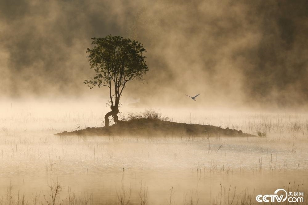 安徽省黃山市黟縣奇墅湖晨霧蒸騰,金色的霞光灑滿整個湖面,熠熠生輝,宛如仙境。