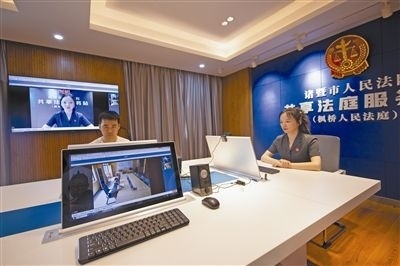 圖③:智慧建設(shè)。圖為諸暨法院楓橋人民法庭在審理一起民間糾紛案件中,因當事人一方遠在外地,故組織雙方線上開庭,當事人表示相當滿意。