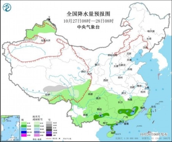 10月27日08時至28日08時,新疆北疆北部、西藏東部等地部分地區(qū)有小到中雪或雨夾雪,局地大雪(5~9毫米)。西南地區(qū)大部、江南大部、華南等地有小到中雨,局地大雨。