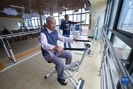 10月26日,在杭州市富陽區(qū)湖源鄉(xiāng)居家養(yǎng)老服務(wù)中心,老人們使用健身器材鍛煉身體。