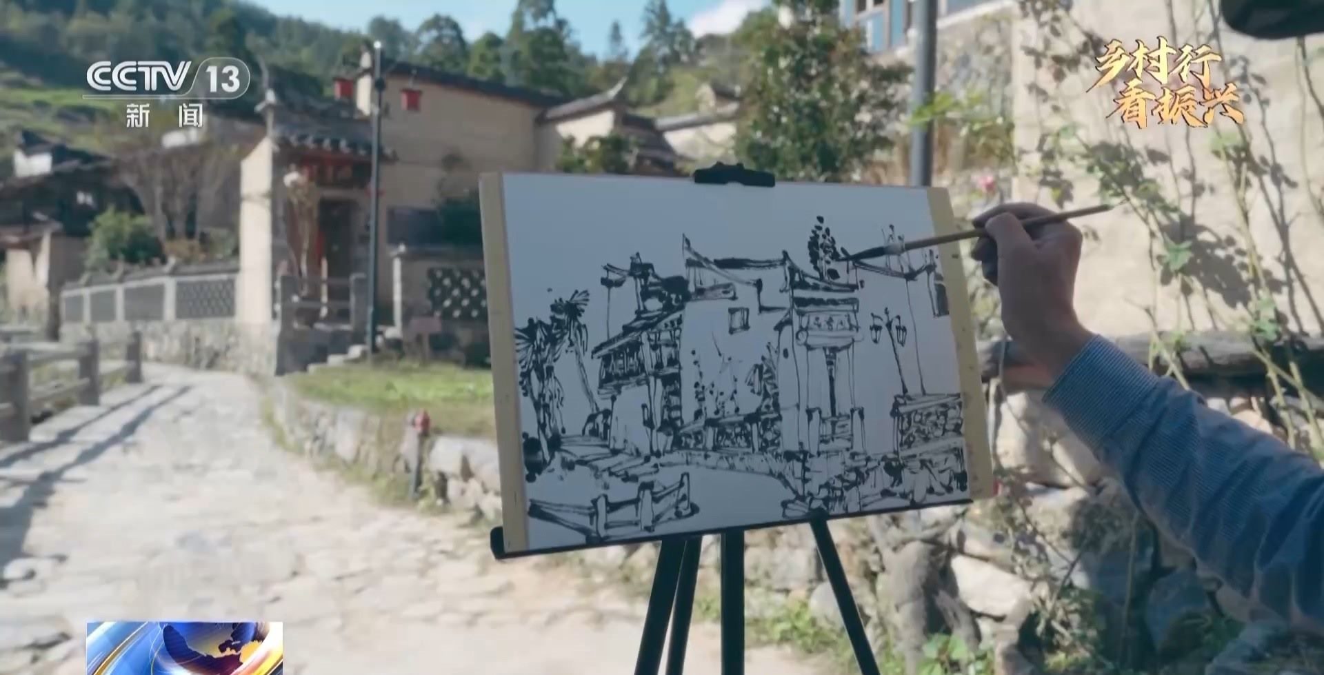 總臺記者 林姍蓉:這里就是龍?zhí)洞?。沿著溪水一路往下,你可以看到兩岸都是這種高低錯落的土夯的民居。這個季節(jié)柿子都熟了,到處都可以看到村民曬柿餅、曬稻谷,黃綠交錯的,非常好看。來到龍?zhí)叮€有一點非常讓我印象深刻,就是在這里每走幾步,我都可以看到一個正在寫生創(chuàng)作的藝術家。