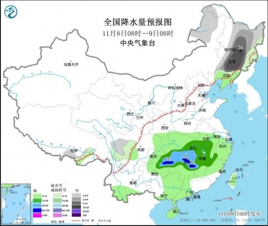 中新網(wǎng)11月8日電 據(jù)中央氣象臺網(wǎng)站消息,預(yù)計(jì)8日至9日,黑龍江中南部、吉林中西部、遼寧北部等地有暴雪和低溫冰凍災(zāi)害風(fēng)險,關(guān)注對交通運(yùn)輸、建筑設(shè)施安全、農(nóng)牧業(yè)、電力通信等的影響;湖南、江西、浙江、福建等地降雨較強(qiáng),注意防范次生災(zāi)害。