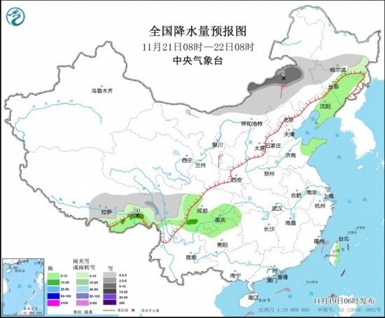 11月21日08時至22日08時,內蒙古中部、黑龍江南部、吉林西部、西藏東南部、川西高原等地部分地區(qū)有小雪或雨夾雪,其中,內蒙古中東部、西藏東部等地部分地區(qū)有中到大雪(5~9毫米)。吉林東部、遼寧中東部、山東半島、西藏東南部、四川南部、重慶南部、貴州西北部等地部分地區(qū)有小到中雨,其中,西藏東南部等地部分地區(qū)有大雨(25~30毫米)。內蒙古西部和中部、寧夏等地部分地區(qū)有4~6級風(見圖4)。