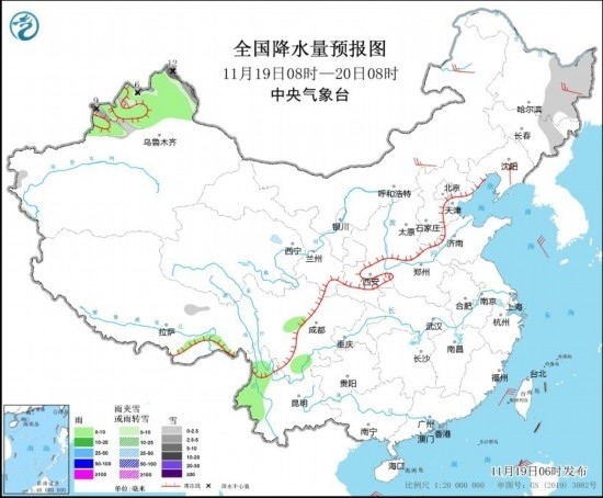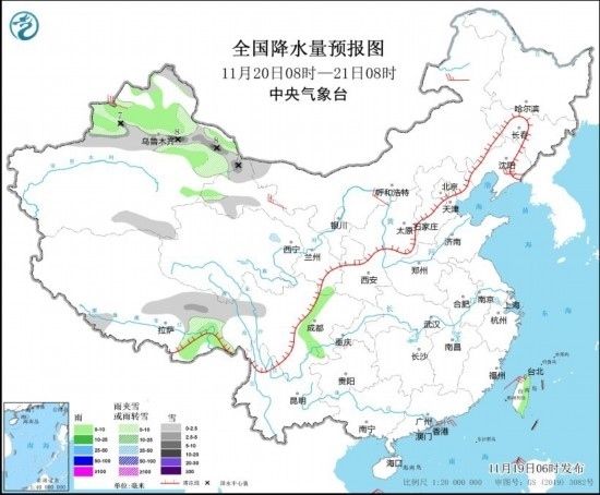11月19日08時至20日08時,新疆北部和伊犁河谷、黑龍江東部、吉林東部等地部分地區(qū)有小雪或雨夾雪,其中,新疆北部部分地區(qū)有中到大雪,局地暴雪(10~12毫米)。新疆北部、西藏東南部、四川南部、云南西部等地部分地區(qū)有小雨。內蒙古中部和東部、黑龍江東部、遼寧東部等地部分地區(qū)有4~5級風(見圖2)。