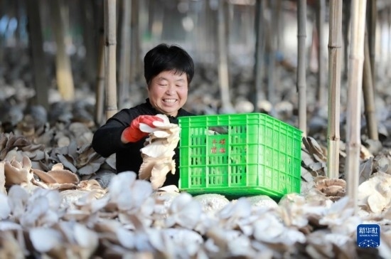 12月6日,在邯鄲市肥鄉(xiāng)區(qū)毛演堡鎮(zhèn)路堡村,菇農(nóng)在收集菌菇。