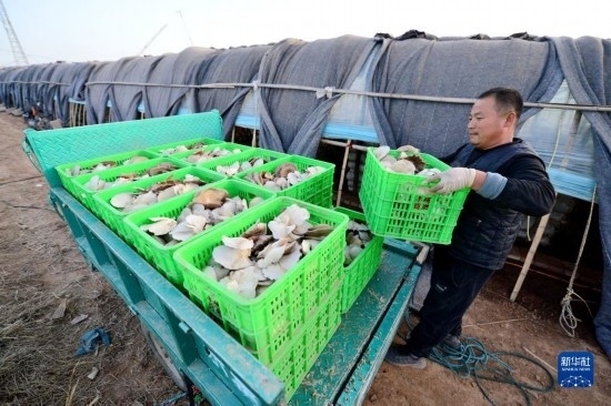 12月6日,在邯鄲市肥鄉(xiāng)區(qū)毛演堡鎮(zhèn)路堡村,菇農(nóng)在搬運(yùn)菌菇。