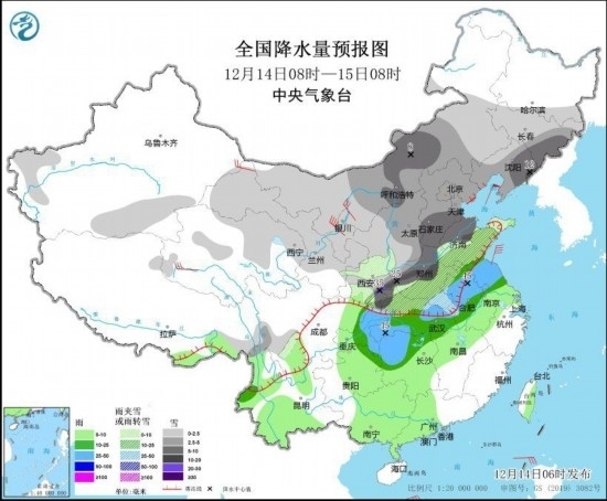 12月14日至15日,中東部地區(qū)有大范圍雨雪天氣過程,西北地區(qū)中東部、內(nèi)蒙古、華北、黃淮中北部、遼寧、吉林有小到中雪,其中陜西南部、華北南部、黃淮北部、遼寧東部、吉林東部等地的部分地區(qū)有大到暴雪,局地大暴雪或特大暴雪;陜西南部、河南、山東中部、湖北西部和東北部、安徽西部等地部分地區(qū)有凍雨;黃淮南部、江淮、江漢、重慶及江南等地有中到大雨,局地暴雨,部分地區(qū)伴有高架雷暴。