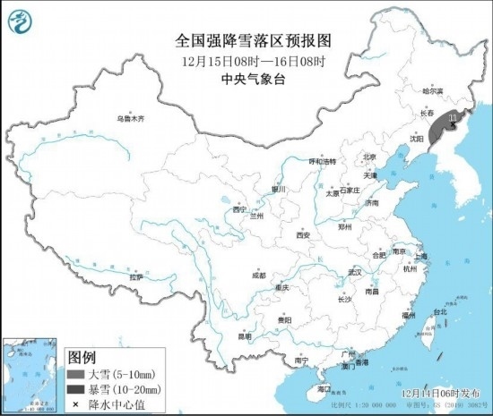 12月15日08時至12月16日08時,吉林東部、遼寧東北部等地部分地區(qū)有大雪,其中,吉林東部長白山地區(qū)局地有暴雪(10~11毫米)。上述部分地區(qū)新增積雪深度3~8厘米,局地可達(dá)10厘米以上。