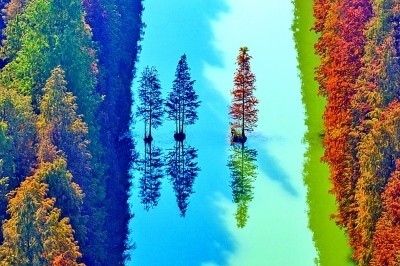初冬時(shí)節(jié),江蘇淮安金湖縣水上森林景區(qū)五彩斑斕。新華社發(fā)