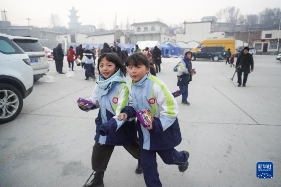 12月19日,在甘肅省臨夏回族自治州積石山保安族東鄉(xiāng)族撒拉族自治縣大河家鎮(zhèn)大河村,兩名女孩在領取物資。