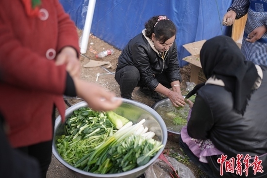 12月20日下午,青海省海東市民和縣中川鄉(xiāng)金田村,在救助點準備飯菜的婦女。中青報·中青網(wǎng)記者 李雋輝/攝