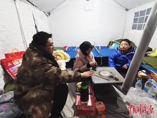 幸運的是,李琴沒有受傷,但家卻回不去了。她只能和村里的多數(shù)人一樣,在玉米地里“湊合了一晚”。第二天,村里發(fā)來帳篷,還有一箱方便面和火腿腸。物資有限,李琴和親戚兩家9個人擠一頂帳篷,裹上最厚的棉衣,生了火,但還是冷得發(fā)抖。一到晚上,帳篷內(nèi)壁全掛著冰碴兒,“只能說勉強受得住”。