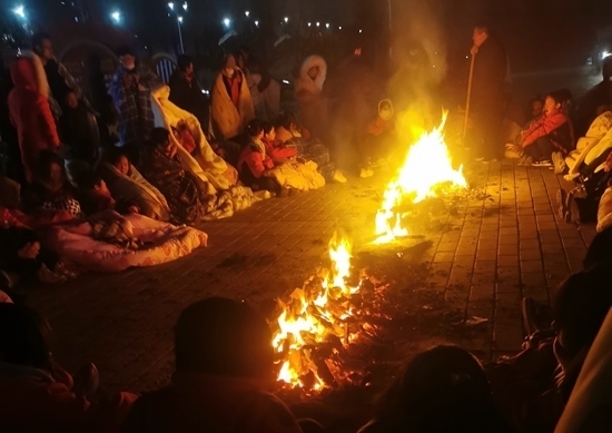12月19日凌晨,積石山縣高關(guān)初級中學的學生圍坐烤火。受訪者供圖
