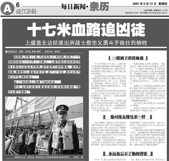 “這段路,只有17米??蛇@僅僅17米的路,見證了一個英雄的誕生——9月11日晚上,上虞市蓋北邊防派出所戰(zhàn)士詹忠義在追擊歹徒時,被歹徒用刀刺中腹部。他忍著劇痛,捂著傷口,緊追歹徒不放,追了17米后,詹忠義終于體力不支,倒在地上……這17米的路上,灑滿了他的鮮血……”