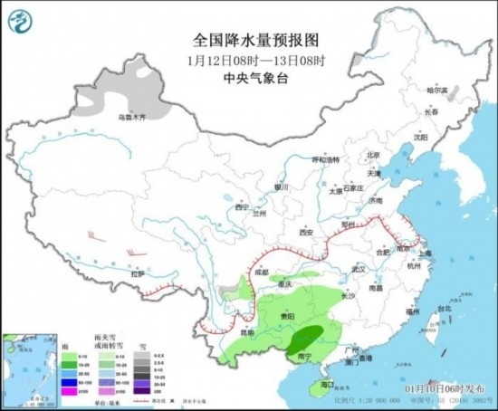 1月12日08時至13日08時,新疆北疆北部、川西高原南部等地部分地區(qū)有小雪或雨夾雪。四川盆地南部、湖南西部、貴州、云南東部和南部、廣西、海南島等地部分地區(qū)有小到中雨。西藏中部部分地區(qū)有5~6級風(fēng);南海東部和西南部等海域有6~7級風(fēng)、陣風(fēng)8級。