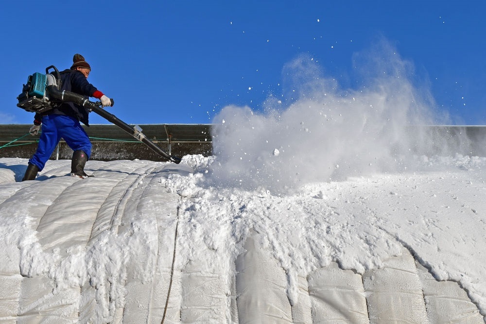2023年12月17日,農(nóng)民在山東省煙臺市福山區(qū)門樓街道用鼓風(fēng)機(jī)清理暖棚上的積雪。新華社發(fā)(孫文潭攝)