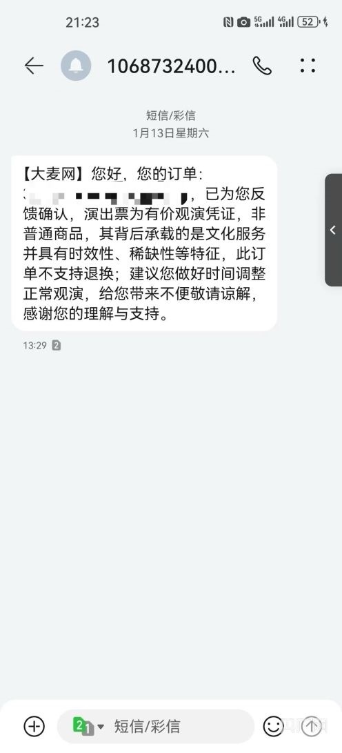 周女士說自己第一時間就通過多個渠道嘗試退票,但都沒有成功。“人工客服的工作時間是早上9點(diǎn)到晚上8點(diǎn),我打電話的時候不在他們工作時間范圍內(nèi)。當(dāng)時也確實(shí)聯(lián)系不到其他渠道,于是我就在12315,包括黑貓投訴進(jìn)行退票退款的申請。13號早上9點(diǎn),大麥客服說此訂單不支持退換,13號下午1點(diǎn)半的時候,給了我一個反饋短信,說是已為我反饋確認(rèn),演出票為有價觀影憑證非普通商品,其背后承載的是文化服務(wù),并具有時效性、稀缺性等特征,此訂單不支持退換,然后就建議我做好時間調(diào)整正常觀演?!?/p>
