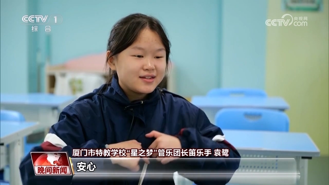 廈門市特教學(xué)?!靶侵畨?mèng)”管樂團(tuán)長(zhǎng)笛 袁鷺:我跟不上他們,然后老師肩膀拍我才可以跟得上。