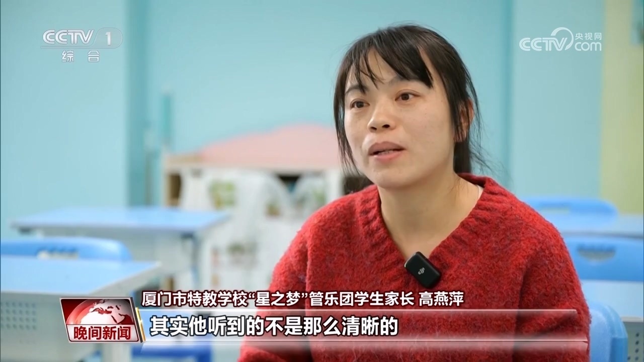 廈門市特教學(xué)校“星之夢(mèng)”管樂團(tuán)學(xué)生家長(zhǎng) 高燕萍:其實(shí)他聽到的不是那么清晰的,但是他會(huì)覺得這個(gè)聲音很美,他用手語(yǔ)告訴我,他覺得很美。