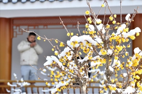 2024年1月22日,一場(chǎng)大雪過后,湖北省襄陽(yáng)市??悼h蠟梅公園內(nèi)的蠟梅傲雪綻放,黃色的蠟梅和白色的積雪相映成趣,美不勝收。