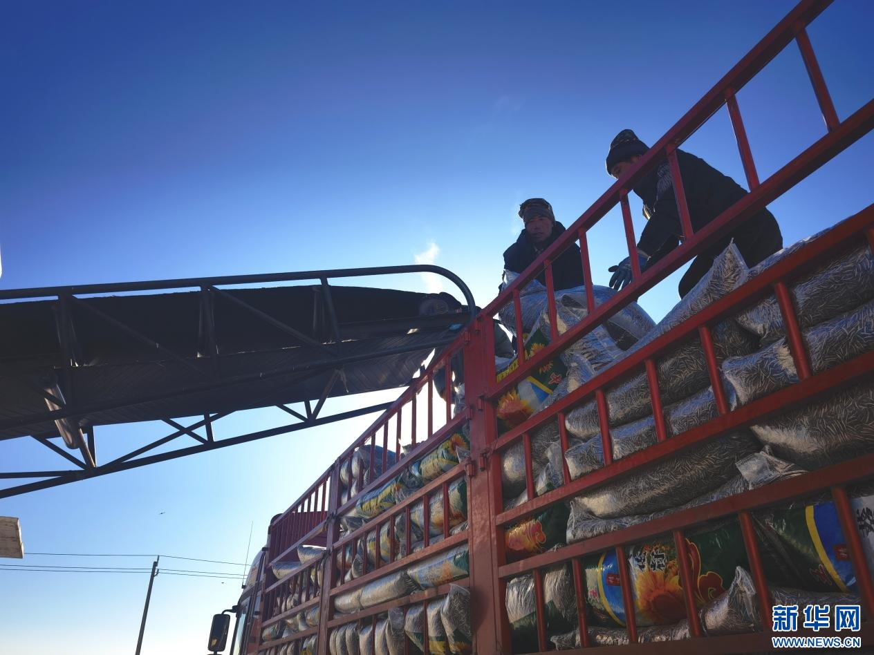 ??1月26日,內(nèi)蒙古包頭市固陽縣紅泥井村糧油交易綜合市場內(nèi),工人們正在裝配葵花籽。新華網(wǎng)郝芳芳攝