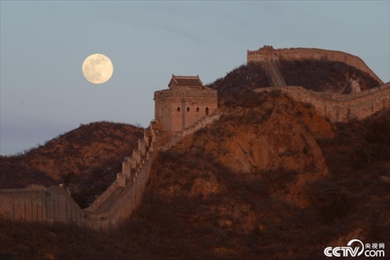 2024年1月25日,農(nóng)歷臘月十五,河北承德,傍晚時(shí)分,圓月映襯下的金山嶺長(zhǎng)城,唯美壯觀。