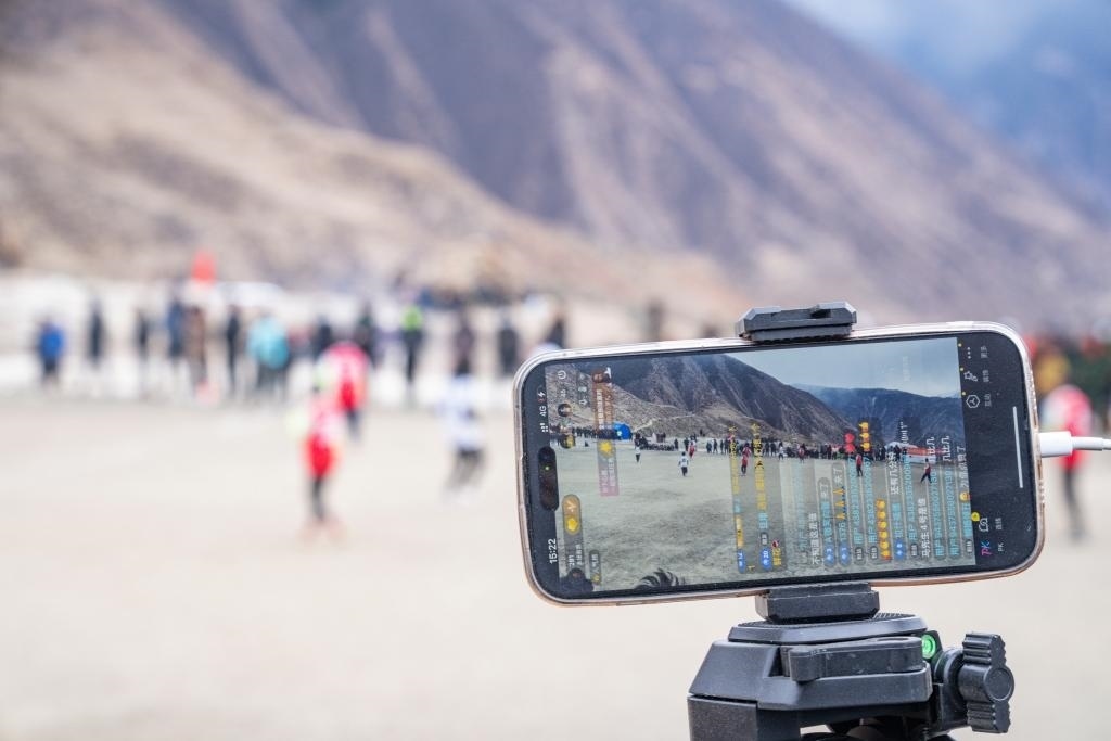 在馬利村的足球場邊,一名村民用手機直播比賽(1月21日攝)