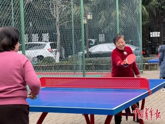 小孩子在追逐嬉鬧,老人們手拿乒乓球拍切磋技藝。不冷的冬日中,成都市青羊區(qū)蘇坡街道清波社區(qū)黨群服務(wù)中心門(mén)前的廣場(chǎng)十分熱鬧。