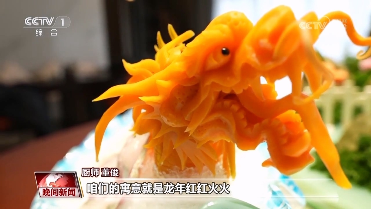 廚師 董?。?/strong>把魚切成薄片,用濃湯涮熟,擺盤呈現一條龍的造型,咱們的寓意就是龍年紅紅火火、風調雨順、年年有余。