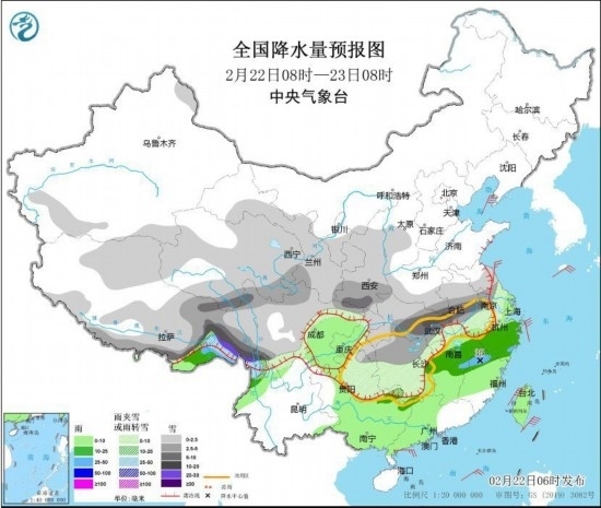 預計,2月22日8時至23日8時,陜西南部、安徽中部、湖北中東部、四川盆地東北部以及西藏東部、青海南部、云南西北部等地部分地區(qū)有大雪,其中,西藏東南部、湖北東部等地部分地區(qū)有暴雪(10~15毫米)。上述部分地區(qū)新增積雪深度3~6厘米,局地可達8~10厘米;安徽中南部、江蘇西南部、浙江西北部、湖北中東部和南部、湖南大部、江西西北部、貴州東部、重慶東南部等地的部分地區(qū)有凍雨或冰粒,凍雨量1~5毫米,局地10毫米以上。中央氣象臺2月22日6時繼續(xù)發(fā)布暴雪黃色預警和冰凍黃色預警。廣西東北部、湖南南部、江西中北部、浙江、福建西北部、廣東中西部和西南部沿海等地的部分地區(qū)有中到大雨,局地伴有雷暴。