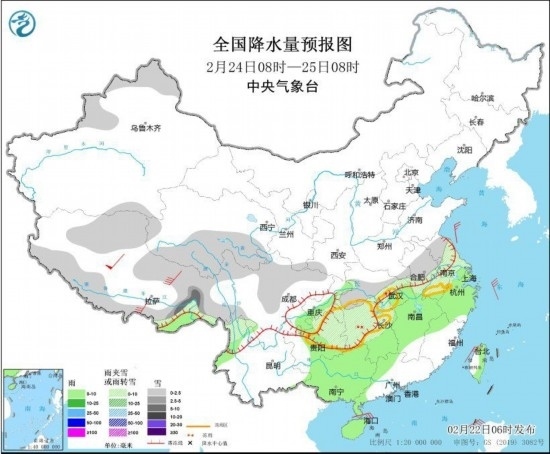 2月24日8時至25日8時,新疆北部、西藏西部和東部、青海南部、川西高原中北部、云南西北部、貴州東部、重慶東部、湖南中北部、湖北中南部、河南南部、安徽大部、江蘇大部等地部分地區(qū)有小雪或雨夾雪,其中,西藏東南部有中到大雪。西藏東南部、重慶中部、貴州中部、江淮東部、江南大部、華南西部和北部、海南島、臺灣島等地部分地區(qū)有小雨。西藏中部等地部分地區(qū)有5~6級風,陣風7~8級;東海西部、臺灣海峽、南海東北部海域有6~7級風、陣風8級。