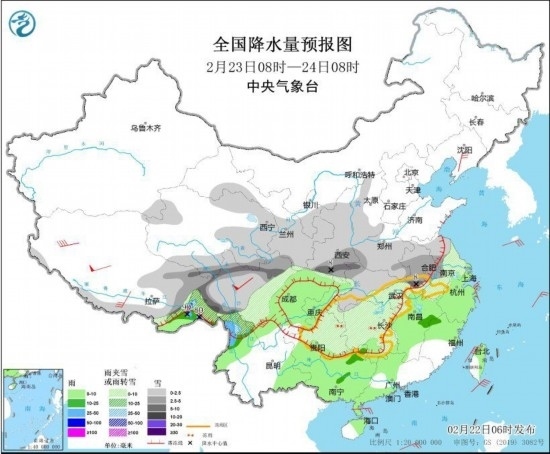 2月22日8時至23日8時,新疆西南部、西藏大部、川西高原、西北地區(qū)大部、山西西部、江淮、江漢、江南北部、河南西部和南部、湖南大部、重慶東部、云南西北部、貴州東部等地部分地區(qū)有小到中雪或雨夾雪,其中,陜西南部、安徽中部、湖北中東部、四川盆地東北部以及西藏東部、青海南部、云南西北部等地部分地區(qū)有大雪,局地暴雪(10~15毫米)。西藏東南部、江西北部、福建北部、浙江大部、廣西北部等地部分地區(qū)有中到大雨(25~35毫米)。江蘇東部沿海、廣東西南部沿海等地部分地區(qū)有5~6級風;渤海、渤海海峽、黃海、東海、臺灣海峽、臺灣以東洋面、巴士海峽、南海東北部海域有6~7級風、陣風8~9級。