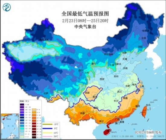 全國最低氣溫預報圖(2月23日8時-25日20時)